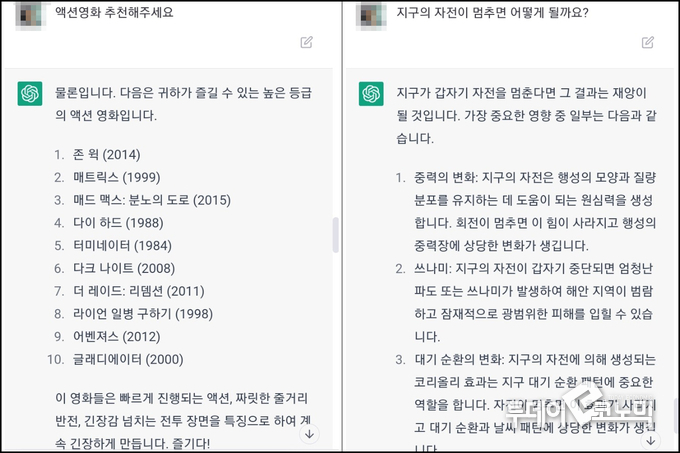 챗GPT의 기본적인 기능은 데이터를 검색하여 알려준다는 것이다. "액션영화 추천해주세요"라는 질문에 10가지의 추천 영화 목록을 보여주거나 "지구의 자전이 멈추면 어떻게 될까요?"라는 질문에 "재앙이 될 것이다. 가장 중요한 영향 중 일부는 다음과 같다"라면서 여러 가지 영향을 리스트화해 보여주었다. 김치볶음밥 맛있게 만드는 방법에 대해서도, 과학퀴즈에 대한 정답도 알려준다.