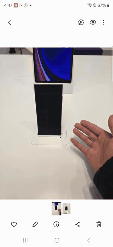 갤럭시 S24 시리즈의 AI 사진편집 기술을 확인해 보았다. 갤럭시S24 울트라를 사진에서 오려내어 손으로 이동시키는 작업이 무리없이 진행됐다. S24울트라가 오려내어진 자리에는 AI가 남은 이미지를 조합해 거치대와 배경으로 채워넣었다.