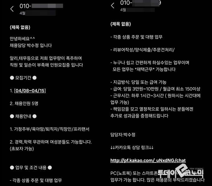 개인 전화번호로 문자를 받았다. 채용담당자라면서 가정주부/육아맘/퇴직자/직장인/프리랜서가 지원 가능하고, 경력이나 학력이 무관하며 초보자가 가능하다고 안내했다. 사실상 모든 사람들이 대상이다.