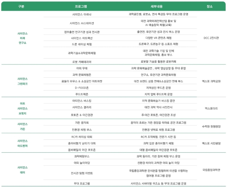 엑스포과학공원과 엑스포 시민광장에서는 개막신과 공연, 체험부스가 운영되며 RC카 레이싱, 종이비행기 챌린지, 흑백과학자 퀴즈 등 전 세대가 함께 참여할 수 있는 프로그램이 펼쳐진다. 마술사 이은결의 인공지능 기반 개막공연이 예정되어 있다.