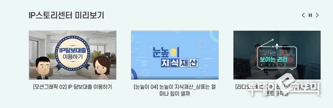 사이트 하단에는 IP스토리센터 미리보기 코너가 마련되어 있다. 평균 3~4분으로 구성되어 지식재산에 관련한 이야기를 쉽게 풀어 설명한 영상들이다. 연예인이나 변호사, 변리사 등이 출연하여 일반인들도 쉽게 관련 지식을 알 수 있도록 구성한 점이 눈에 띄었다. 이 영상들을 유튜브에도 같이 업로드되어 지식재산권에 대한 정보의 접근성을 높였다. 김 주무관이 IP아카데미에서 꼭 봐야할 콘텐츠로 제일 먼저 꼽은 것들이기도 하다. '폰트 저작권', 'IP담보대출 이용하기', '루벤스와 진정한 발명자', '상표는 얼마나 힘이 셀까' 등이 있다.
