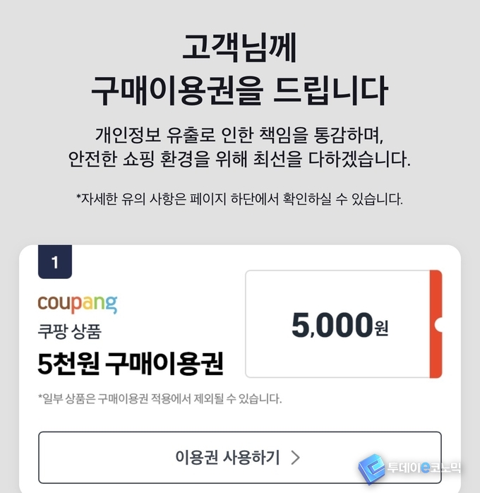 쿠팡은 추가로 유출이 확인된 고객들에게도 기존과 같은 구매이용권을 지급할 예정이다.