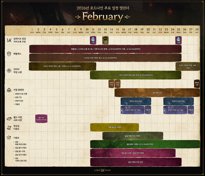이번에 공개된 2월 캘린더에는 로드나인 론칭 1.5주년을 기념한 배틀패스 2종 일정과 지팡이·단검 아바타 픽업 기간, 4차 거점 점령전 등 핵심 콘텐츠 일정이 포함됐다. 또한 월드 서버 이전 일정과 설날 기념 이벤트 계획도 함께 담겼다. 설날 이벤트는 오는 11일부터 총 4종이 순차적으로 진행될 예정이다.