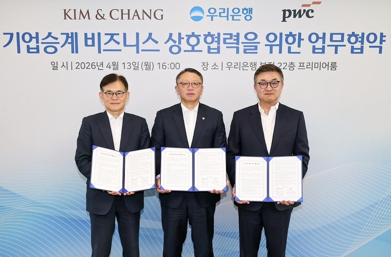 우리은행은 13일 서울 중구 본점에서 김앤장 법률사무소, 삼일PwC와 ‘기업승계 비즈니스 상호협력 업무협약(MOU)’을 체결했다고 밝혔다.