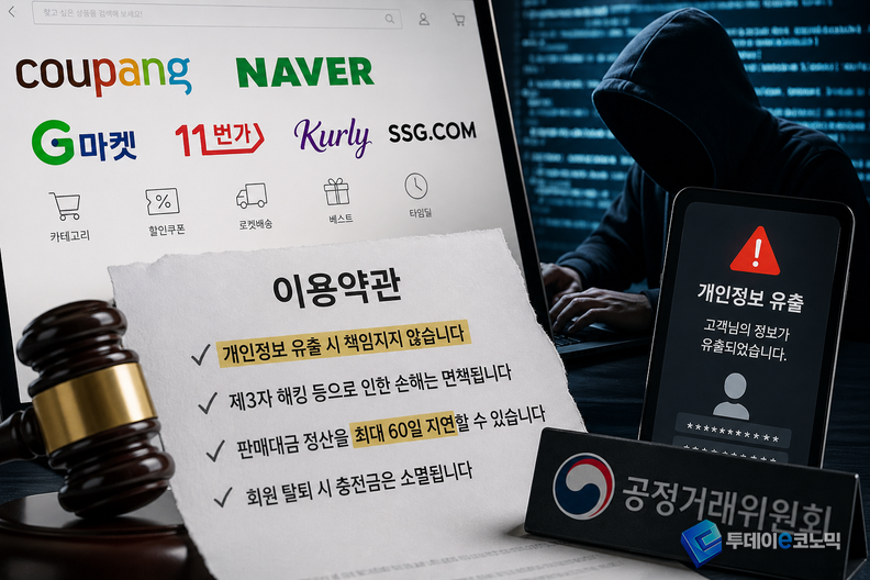 투데이e코노믹 = 우혜정 기자 | 쿠팡·네이버 등 국내 주요 오픈마켓 플랫폼들이 개인정보 유출 사고나 거래 분쟁 발생 시 책임을 회피하는 데 활용해 온 ‘불공정 약관’이 대거 손질된다. 공정거래위원회가 개인정보 보호 책임을 이용자에게 떠넘기거나, 판매대금 정산을 자의적으로 미루고, 탈퇴 회원의 충전금을 소멸시키는 조항 등에 제동을 걸면서 전자상거래 업계 전반의 약관 관행 변화가 불가피해졌다.