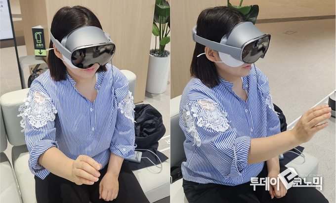 갤럭시XR은 기자의 시선과 손을 인식해 앱을 인식했다. 착용자의 눈동자를 추적하는 카메라와 센서가 장착돼 있다. 다만 기자의 어색한 얼굴 각도처리가 문제였는지 커서가 잘 나타나지 않아 애를 먹었다. 체험을 도와주던 관계자는 기자의 얼굴을 계속 아래로 내려달라 요청했다.
