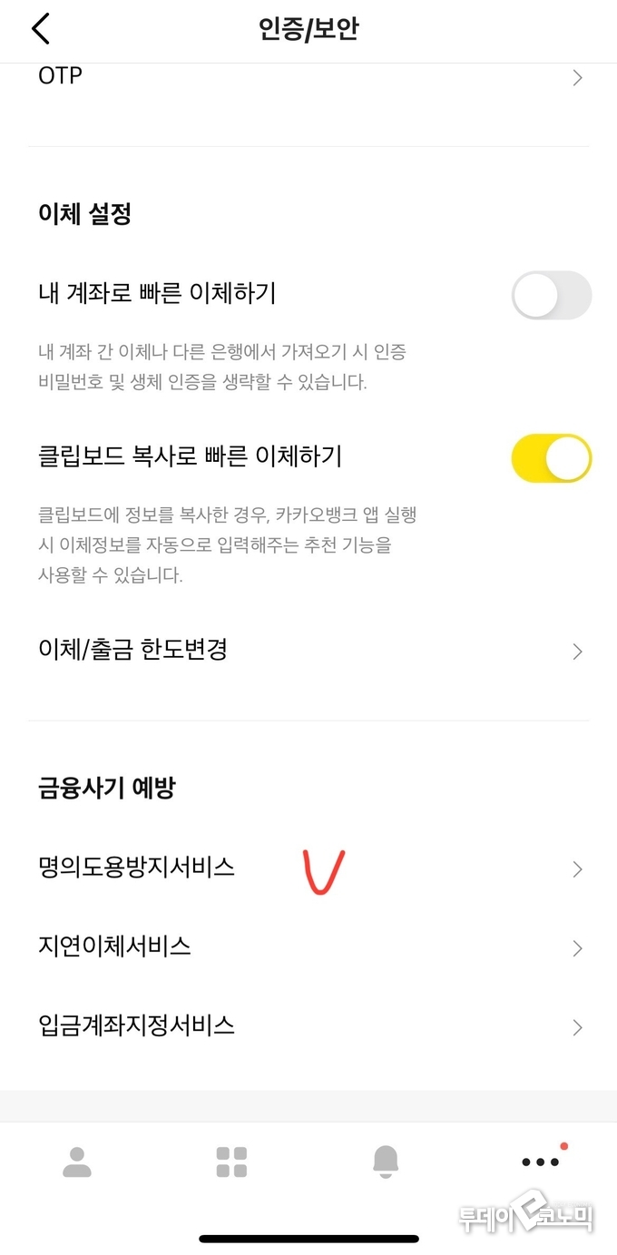 카카오뱅크에 접속하여 인증/보안을 클릭하면