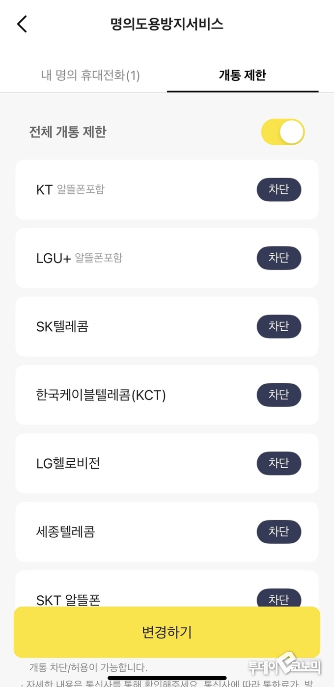 우측 상단에 있는 개통 제한을 눌러 전체 개통 제한을 클릭하면 온라인에서 쉽게 개통가능한 알뜰폰 개통 또한 함께 차단된다.