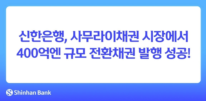 신한은행 관계자는 “일본 투자자들의 높은 관심 속에 사무라이 시장에서 최초의 전환채권을 성공적으로 발행했다”며 “앞으로도 ESG 분야 지원을 확대하고 글로벌 자금 조달 역량을 더욱 강화하겠다”고 말했다.