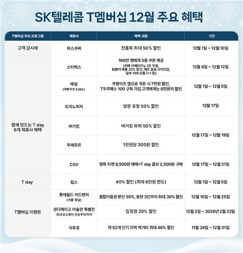 SKT 관계자는 “고객이 연말 시즌을 알차고 즐겁게 보낼 수 있도록 카페·외식·문화·여가 전반에 걸쳐 혜택을 강화했다”며 “앞으로도 고객 경험 향상을 위해 멤버십 프로그램을 지속적으로 업그레이드할 것”이라고 말했다.