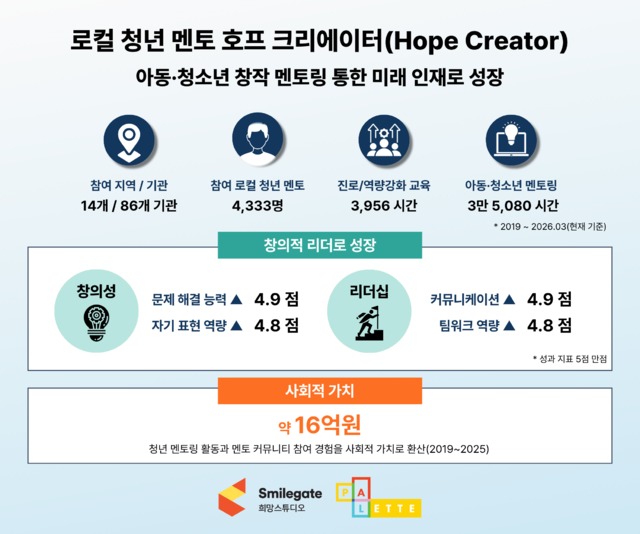 희망스튜디오는 창의 커뮤니티 ‘팔레트’의 청년 멘토 프로그램인 호프 크리에이터 6기가 지난해 9월부터 올해 2월까지 약 20주간 활동을 진행했다고 밝혔다. 이번 기수에는 서울, 전주, 부산 등 전국 9개 지역에서 총 43명의 청년 멘토가 참여했으며, 지역아동센터 아동·청소년과 함께 51개의 창작 프로젝트를 완성했다.