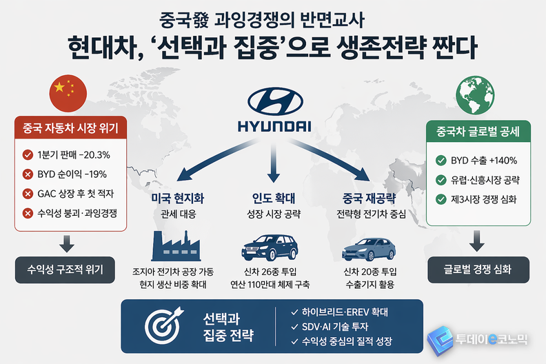 중국 자동차 업계의 현재 모습은 현대차에 하나의 경고이자 반면교사다. 수십 개 브랜드가 뒤엉켜 이익률 4%대에서 출혈 경쟁을 벌이는 구도는, 기술 차별화 없이 시장 점유율 경쟁에만 매몰될 경우 어느 플레이어도 수익을 낼 수 없다는 것을 보여준다. 현대차가 미국 현지화, 인도·신흥시장 확대, SDV 전환이라는 세 축을 동시에 추진하는 전략이 실효를 거두려면, 자원 배분의 우선순위를 명확히 하고 단기 수익성 방어와 장기 경쟁력 투자 사이의 균형을 잃지 않는 것이 관건이 될 것이다.