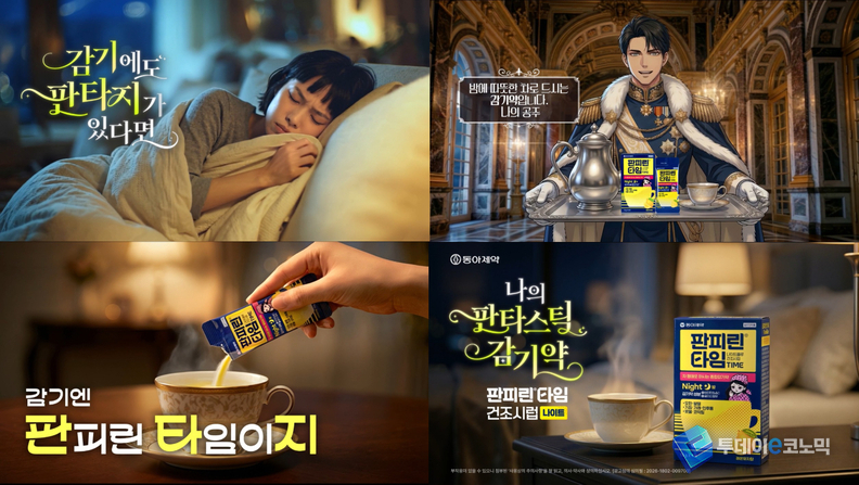 동아제약은 차처럼 마시는 감기약 ‘판피린타임 나이트플루 건조시럽’의 신규 AI 광고를 공개했다고 밝혔다. 이번 광고는 웹툰 형식을 접목한 판타지 콘셉트로 제작돼 제품의 특징과 효능을 보다 직관적으로 전달하는 데 초점을 맞췄다.