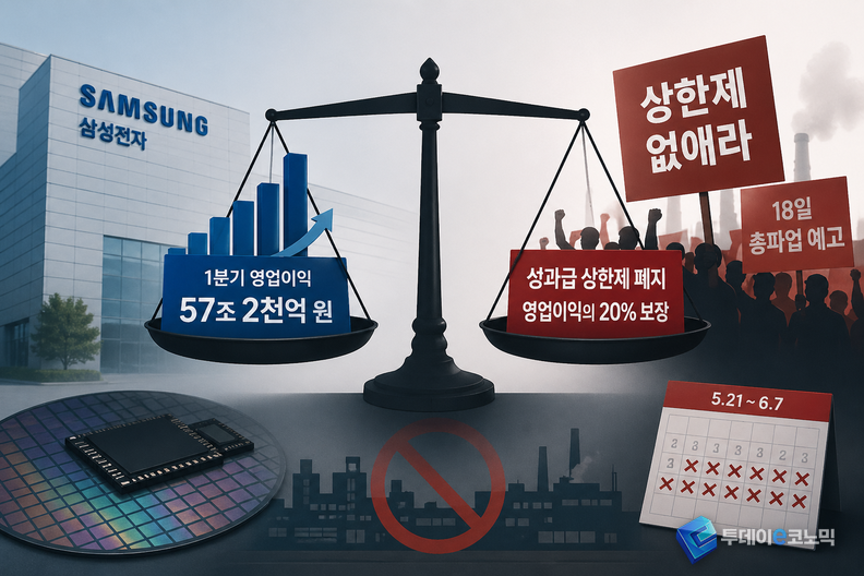 삼성전자가 이달 초 1분기 영업이익 57조 2000억 원을 발표했다. 단일 분기 역대 최고, 작년 연간 실적 전체를 뛰어넘은 숫자다. 그런데 불과 3주 뒤인 4월 23일, 서울 한복판에 삼성전자 노조원 4만 명이 모였다. 구호는 단순하다. "상한제 없애라."